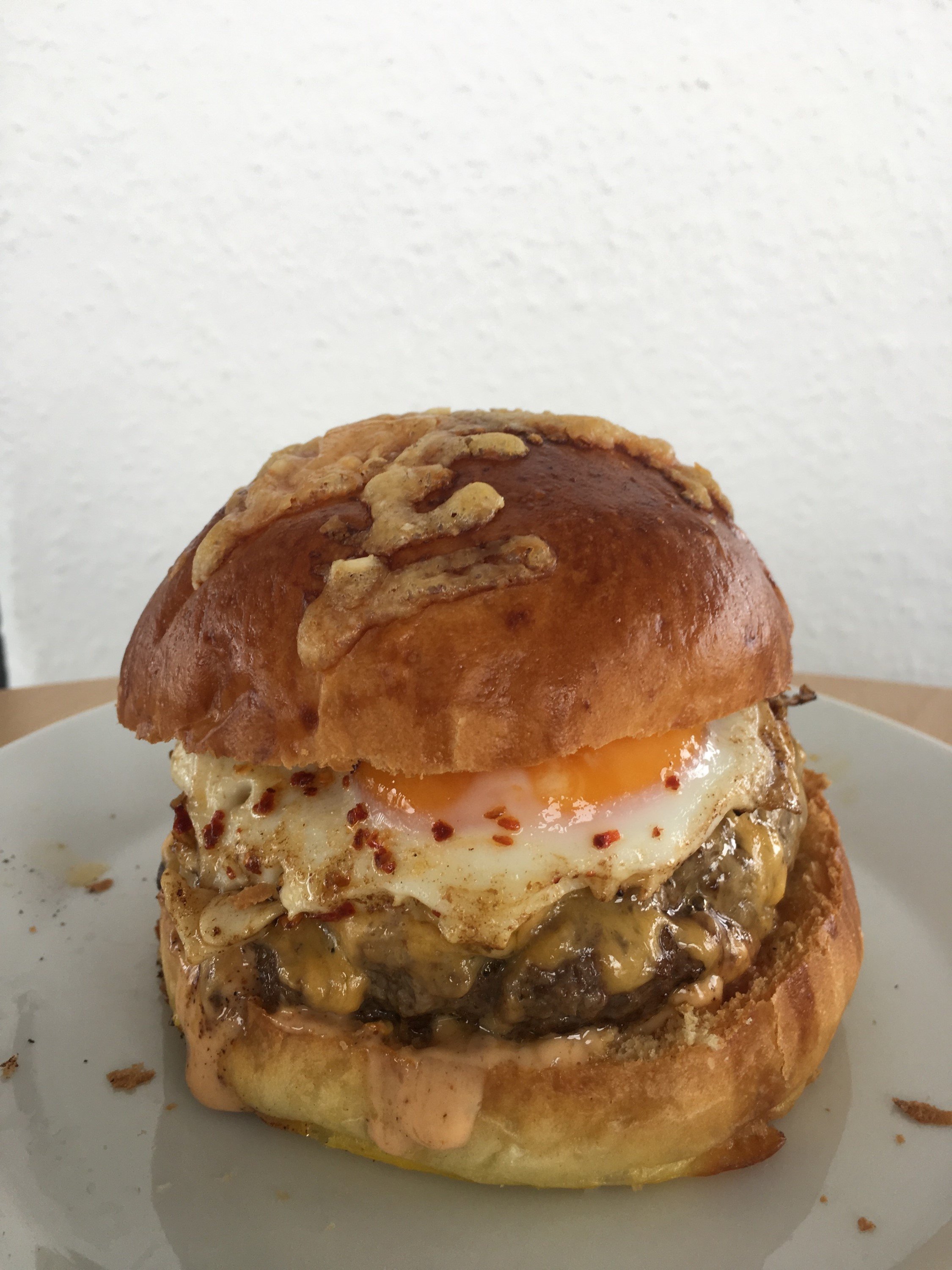 Rezept ist nicht der Rede wert! Einfach ein selbstgebackenes Bun, scharfe Chili Mayo, anständiges Patty mit lecker Käse und da dann leckeres Spiegelei drauf 😊🤤