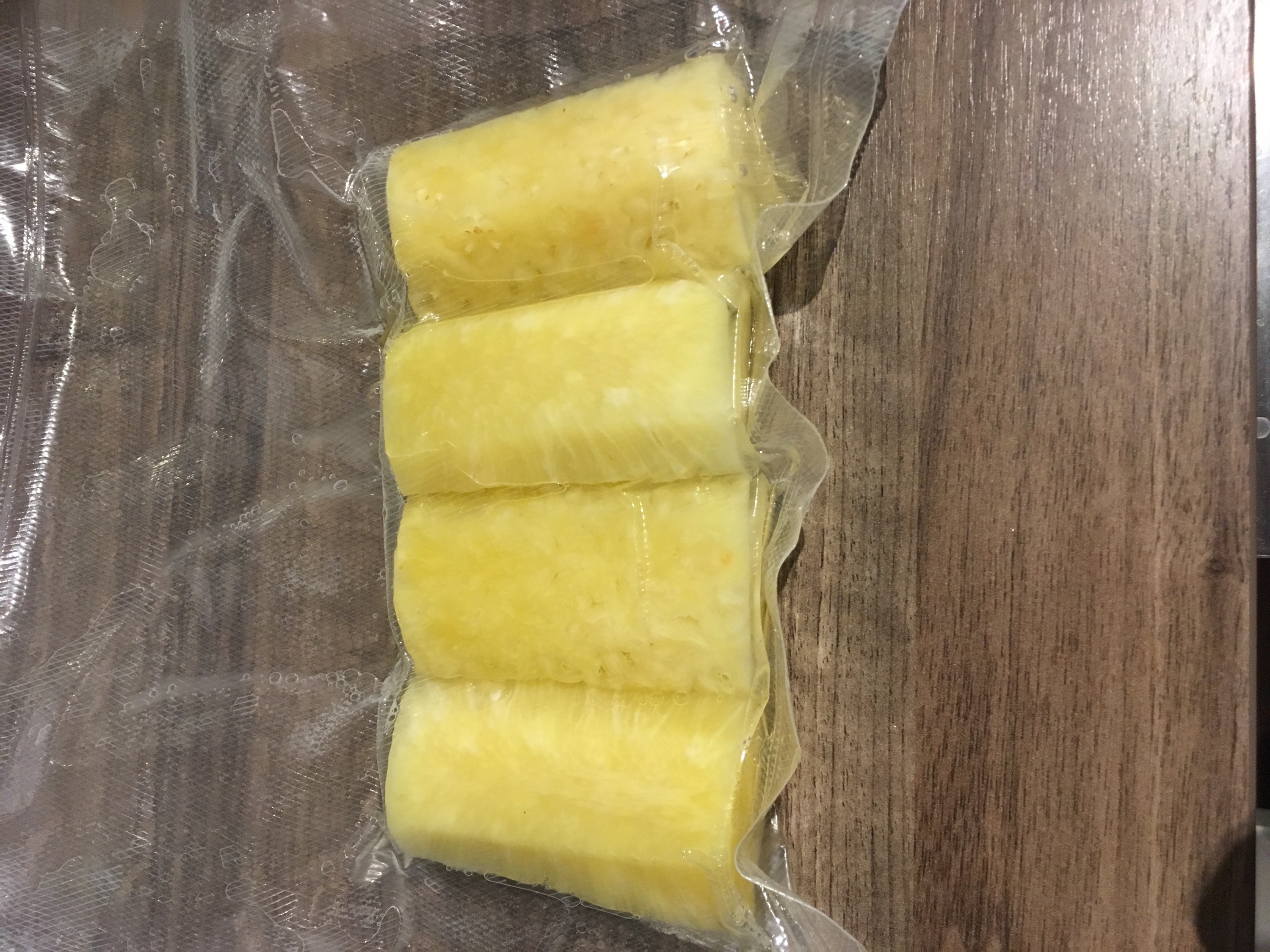 Ananas vierteln und die Filets rausschneiden. Dann schön vakuumieren. Denke hier kann mit Butter und oder Vanille gearbeitet werden. 85 Grad für 60 Minuten. Dann rauspacken, aufs Rost.... mit braunem Zucker bestreuen und für 40 - 60 Sekunden in die dritte Schiene des OHG.