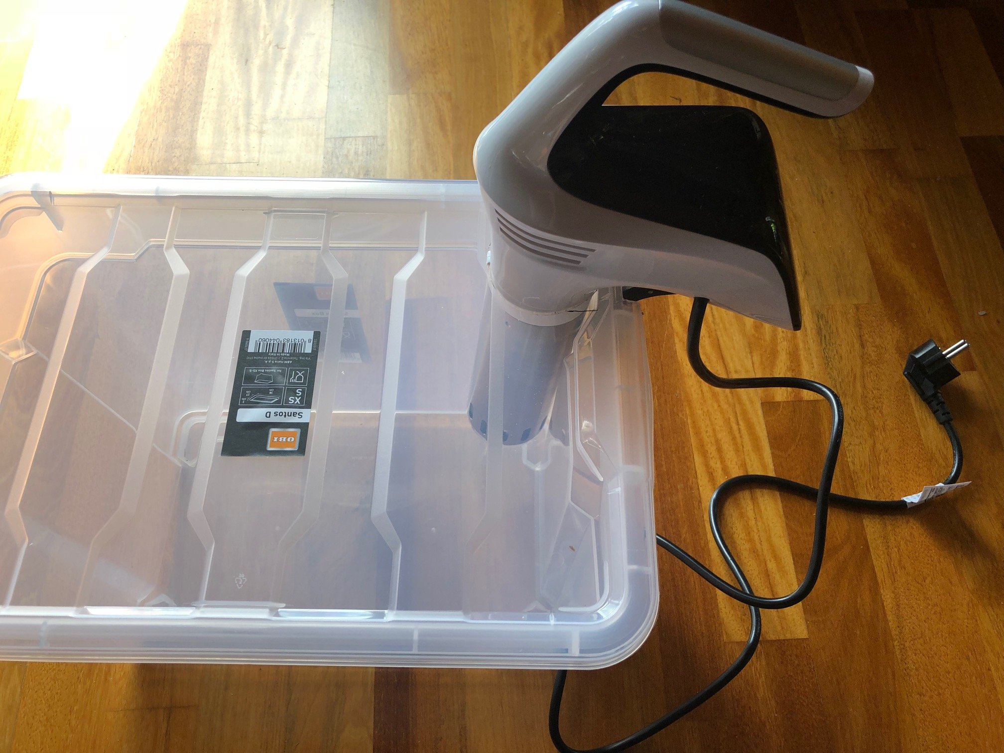 Weiterer Vorteil: Der Sous Vide-Stick und die Folienbeutel passen da auch mit rein. Ist alles sauber verstaut und zusammen.