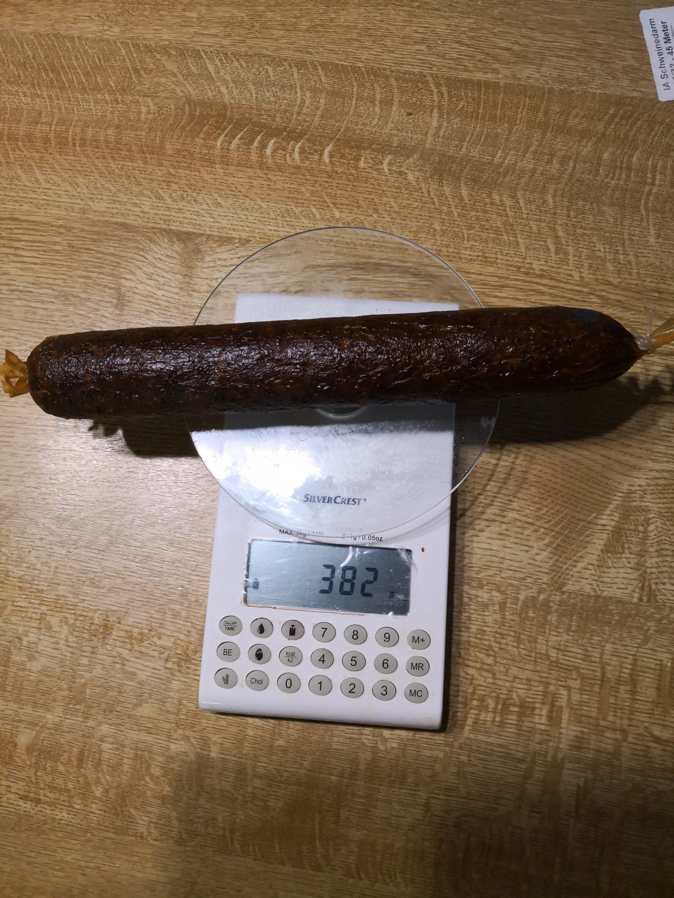 Die große Wurst hat bei ca. 400 g 30% an Gewicht verloren, die kleine sollte bei 320 g fertig sein.