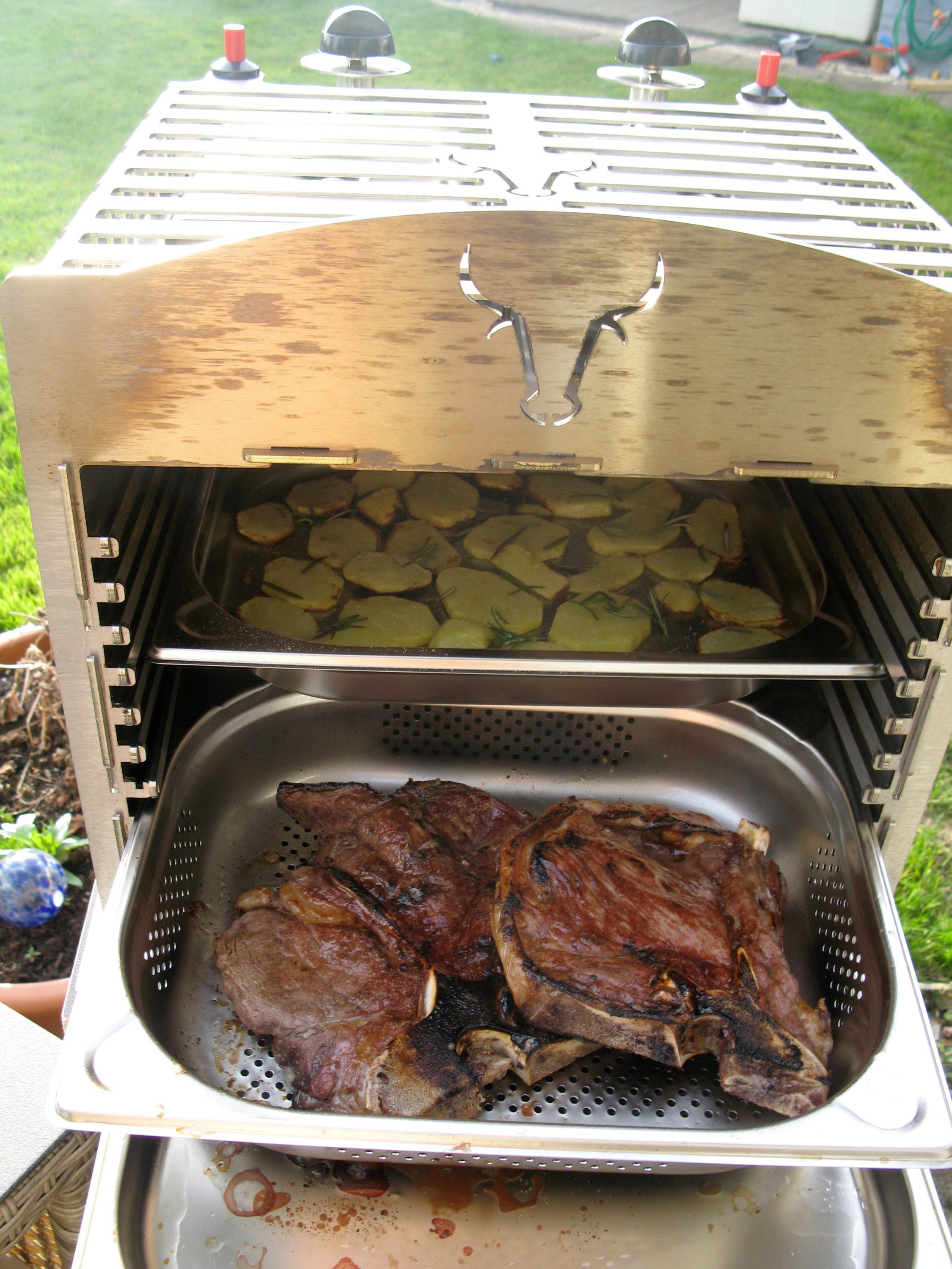 Die Schalen schiebe ich nicht ganz bis hinten durch, dann kommt auch noch etwas Hitze unten am Fleisch zum nachziehen an.