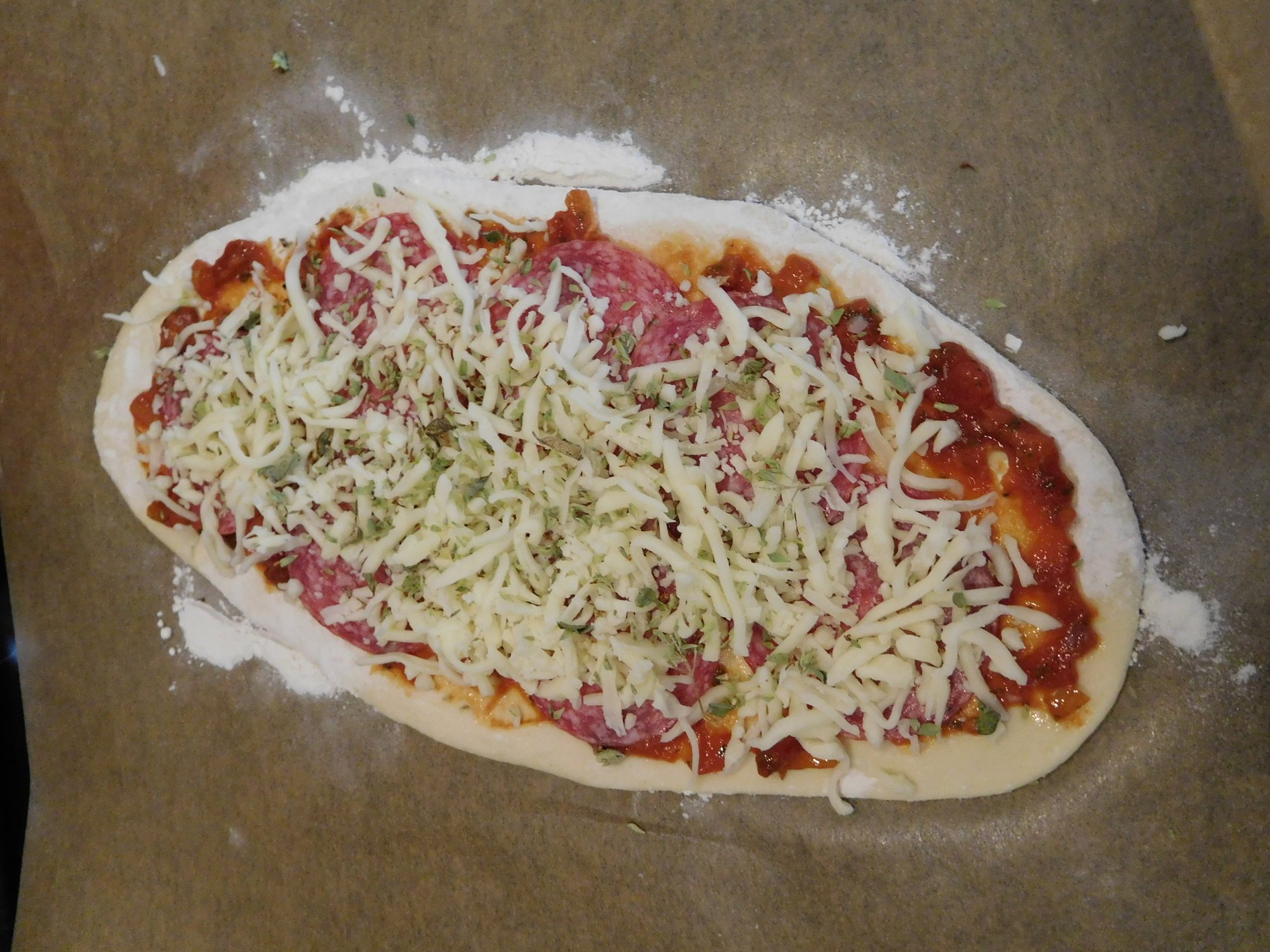 und passend ausrollen....aber ganz wichtig... die untere Seite mit Mehl bestreuen.....also am besten einmal umdrehen....und dann je nach Wunsch belegen......