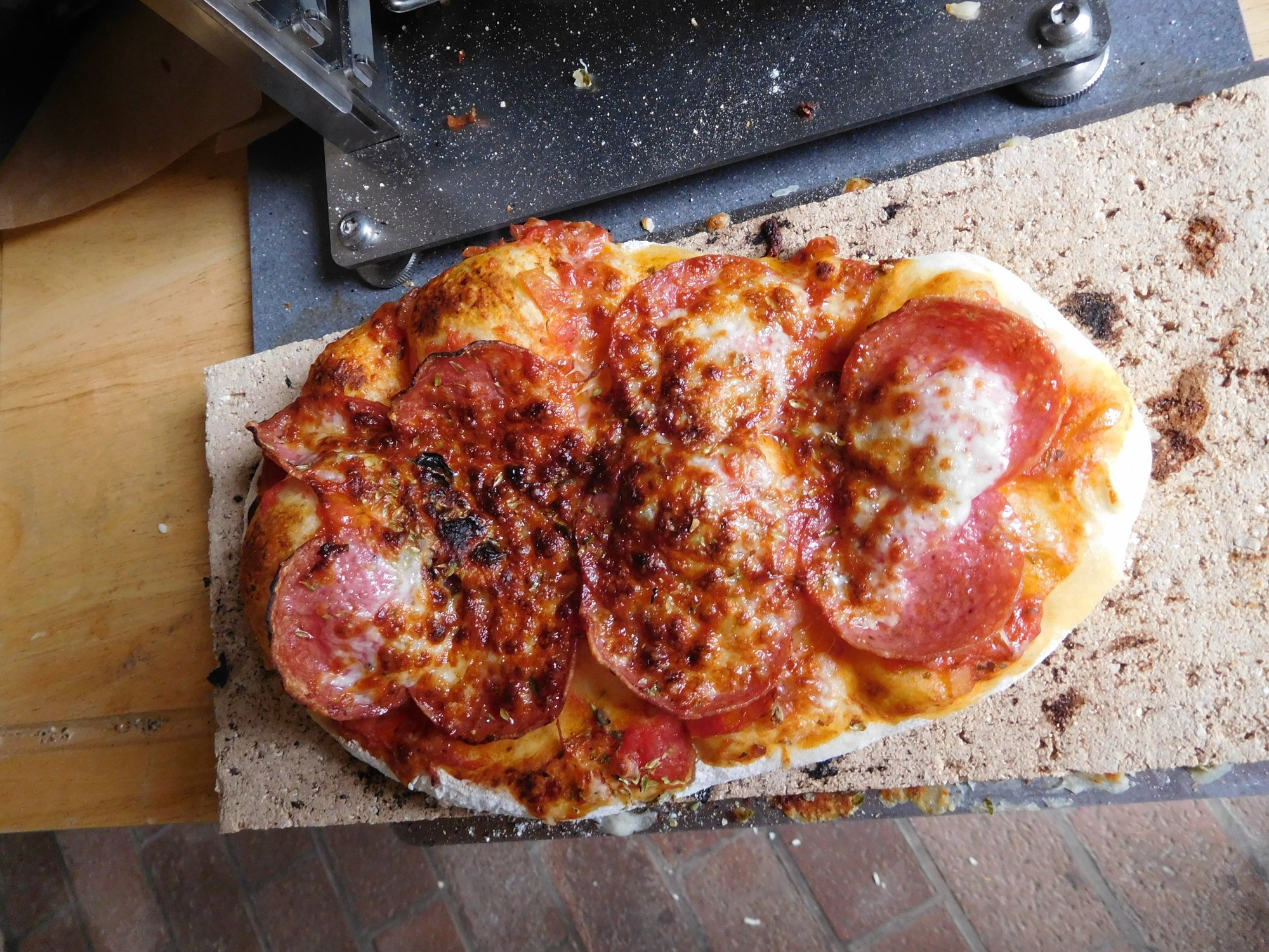 Ich habe dann ein wenig experimentiert..... und am besten wurde die Pizza, wenn ich erst den Stein in der Mitte ca. 5-10 vorgeheizt hatte und ihn dann mit der Pizza auf der dritten Schiene von unten für ca. 2 Minuten drin hatte....