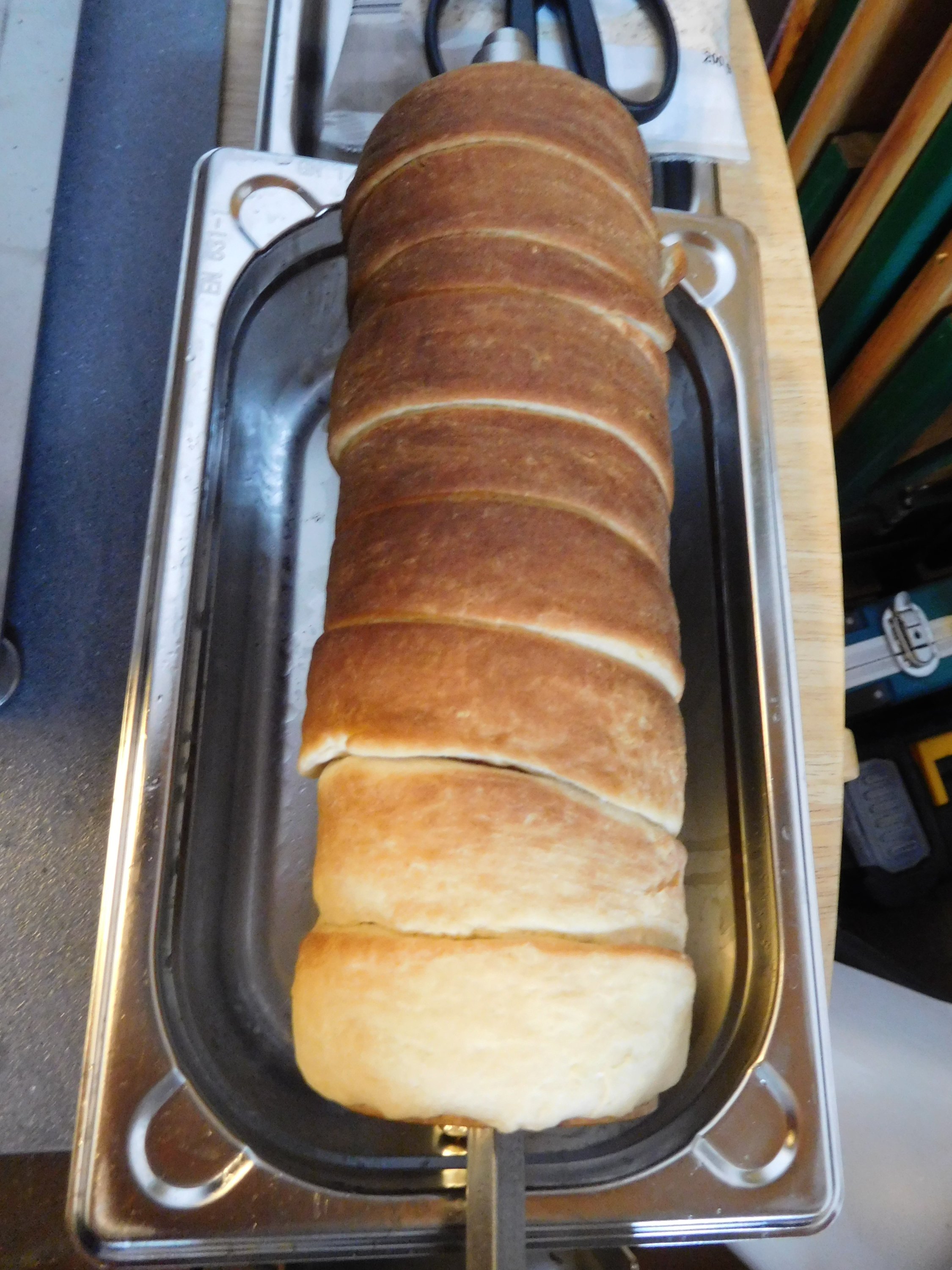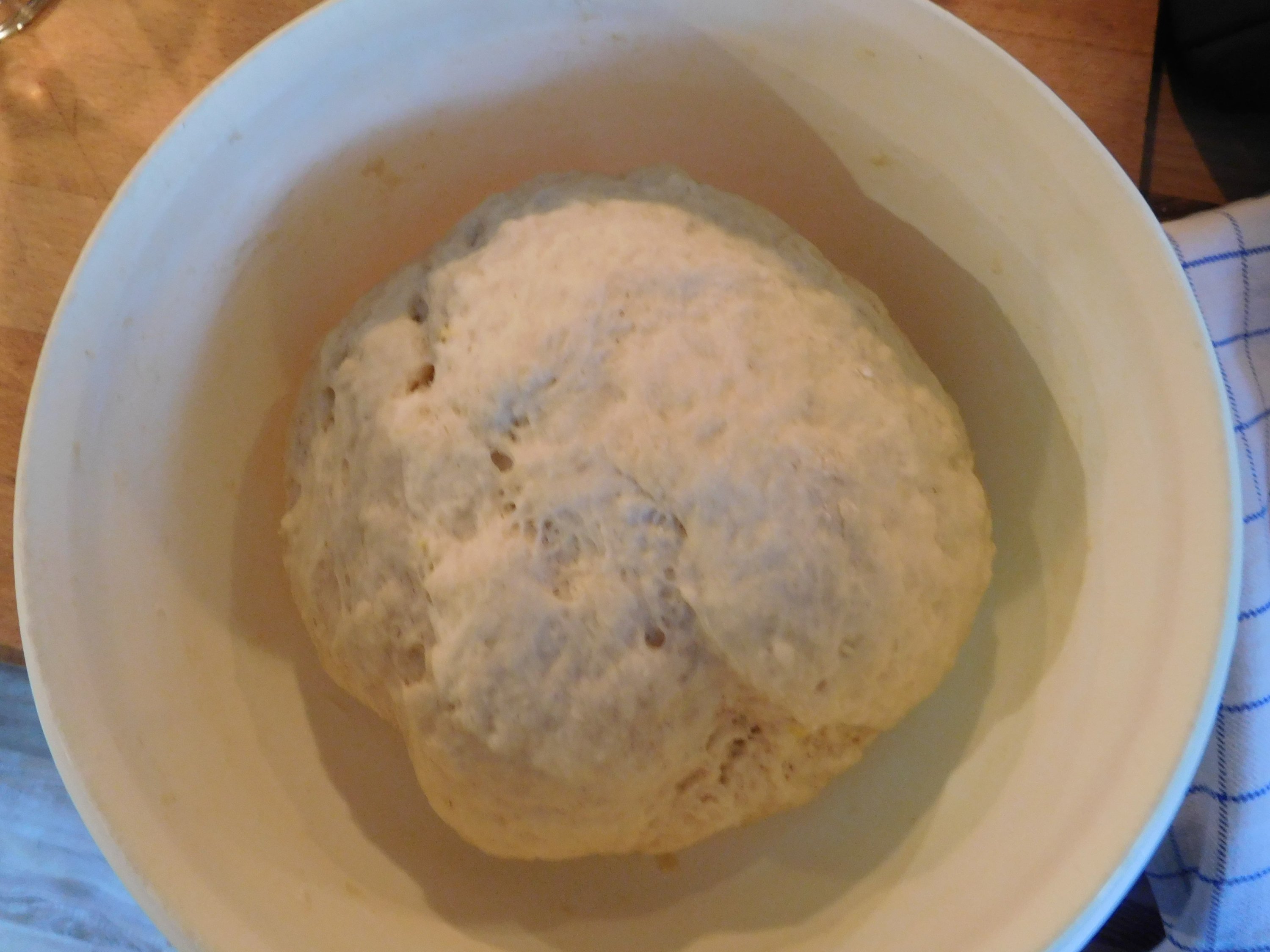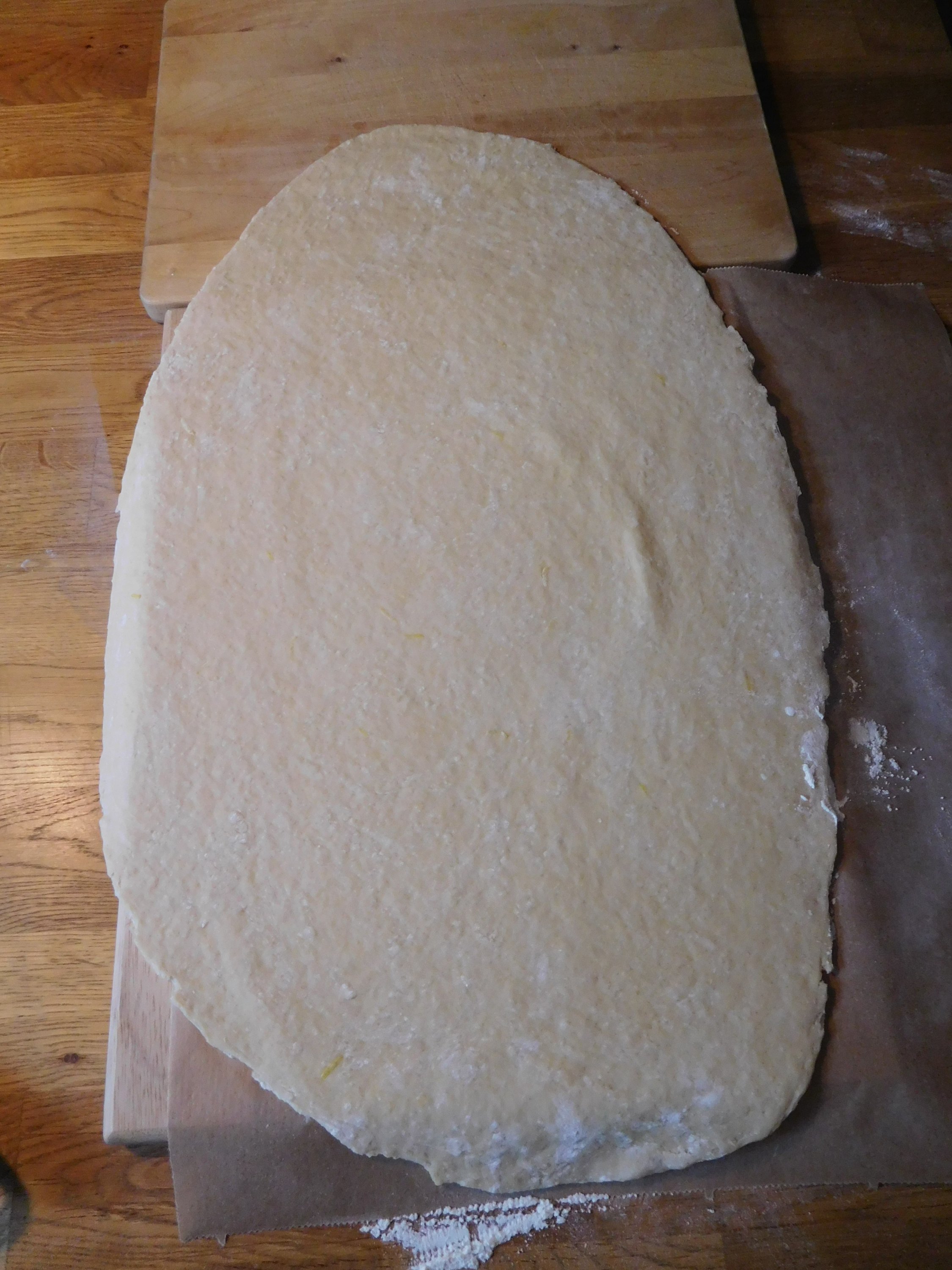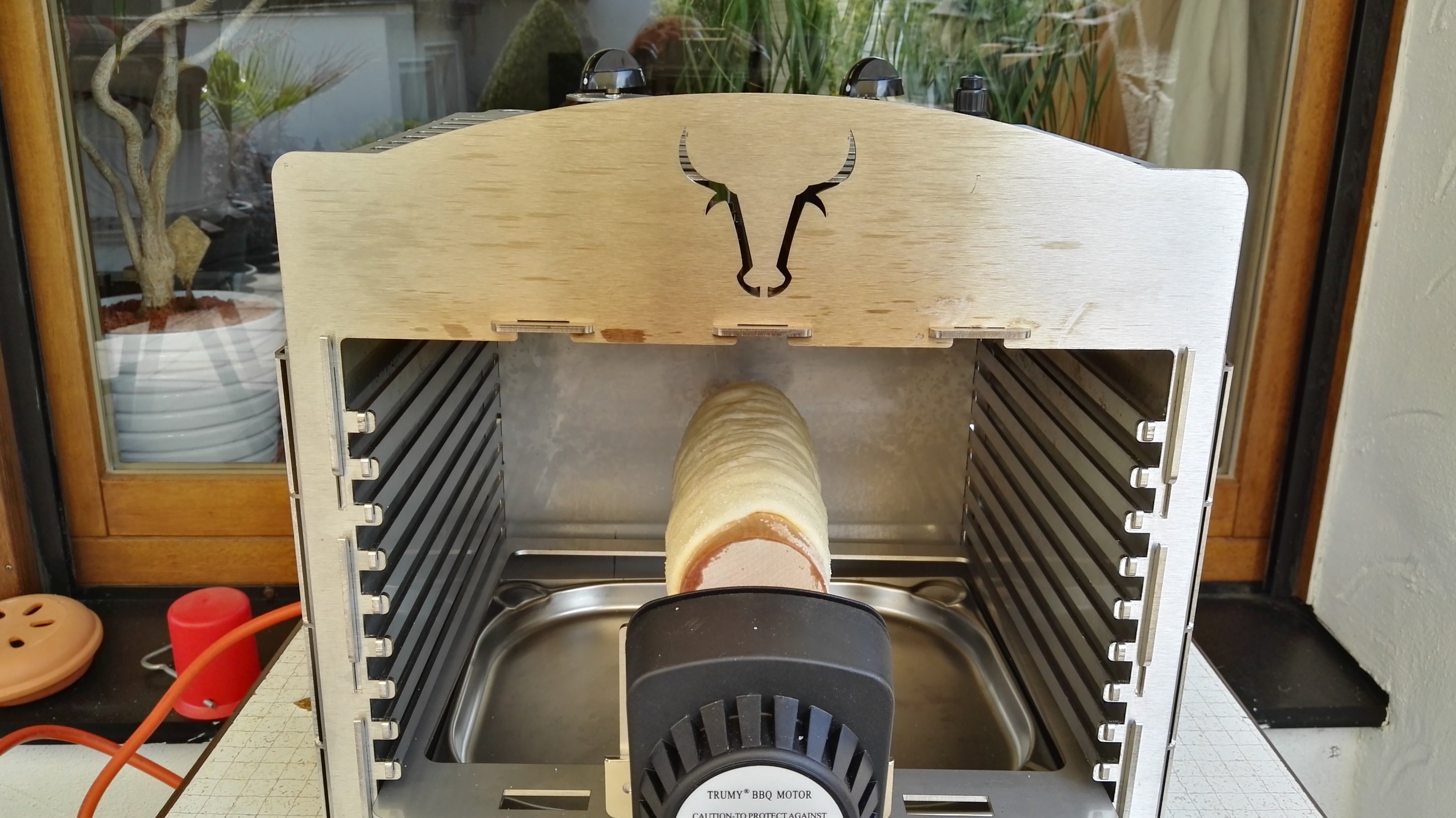 Rauf auf die konisch geschliffene Teigrollen von IKEA und rein in den OHG, nur ein Brenner an auf kleinster Stufe. Roti auf die unterste Einschubmöglichkeit. Ich konnte die Rolle nur zu ca. 2/3 nutzen, da der Teig am vorderen Ende nicht genug HItze abbbekommt.