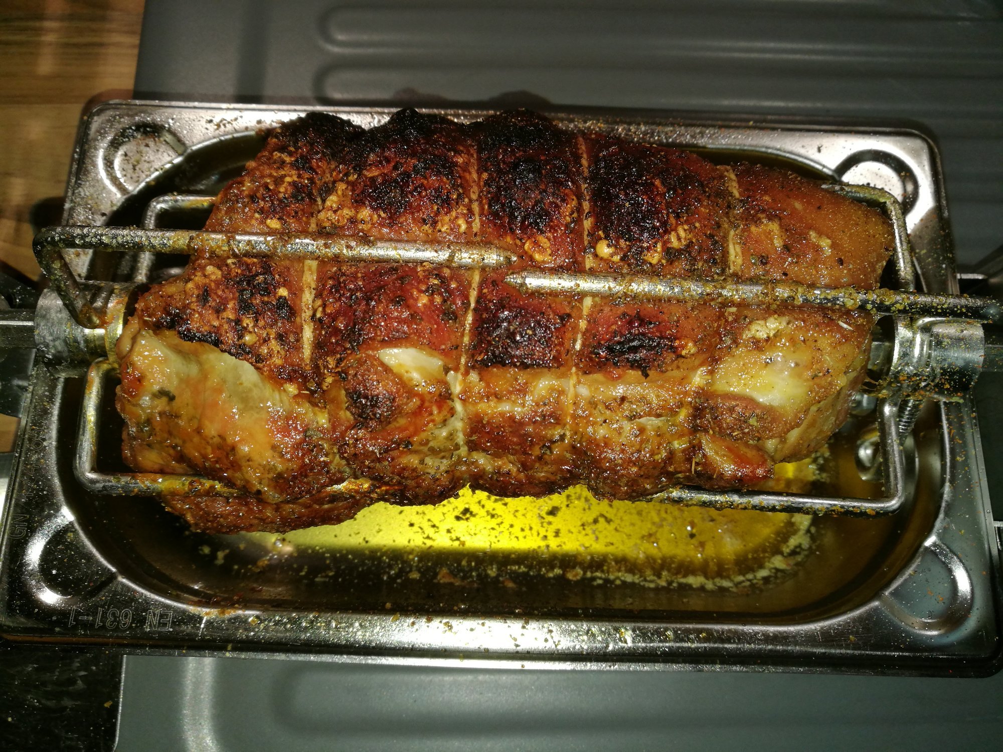 Spanferkel-Rollbraten 1,2 Kg vom Metzger meines Vertrauens per Badewannen-Roti im Single. Vorher auf Zimmertemperatur kommen lassen, dann mit Olivenöl eingerieben, Salz Pfeffer, Rosmarin-Pulver, ein bisschen Paprika edel-süß und Majoran ran......und dann bei kleinster Brennerstellung auf der tiefst möglichen Schiene, für 1,5 Stunden in den Single......boa war das lecker.....und die Kruste war weder zäh noch hart.....einfach nur klasse knusprig.....