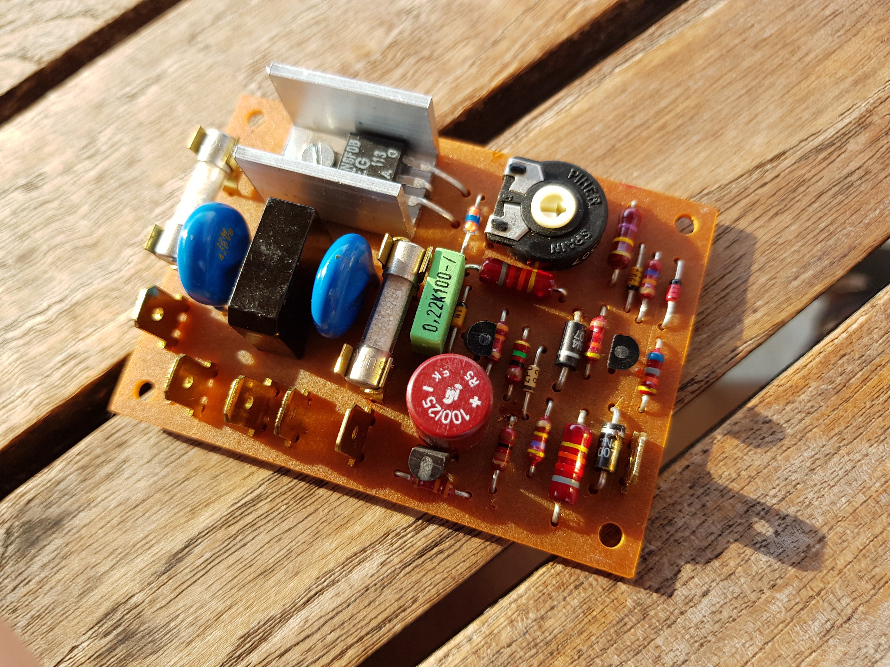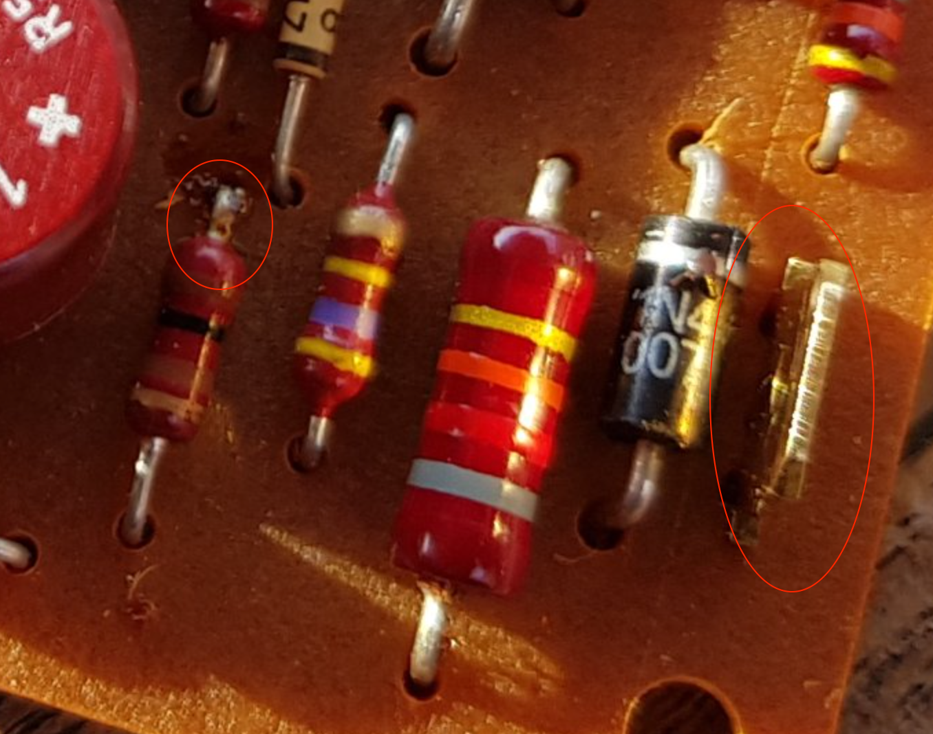 Die Bauteile bis zur Mitte der Platine Sicherungshalter sind alle im normalen E-Shop zu kaufen. Die schwarze Silizium Diode rechts ist eine aus der Serie 1N 4000, wobei die letzte Ziffer die Spannungsfestigkeit angibt. ( z.B. 1N 4001- 1N 4004 ). Eine 4004 kann man anstelle 4001 einbauen. Umgekehrt geht nicht.