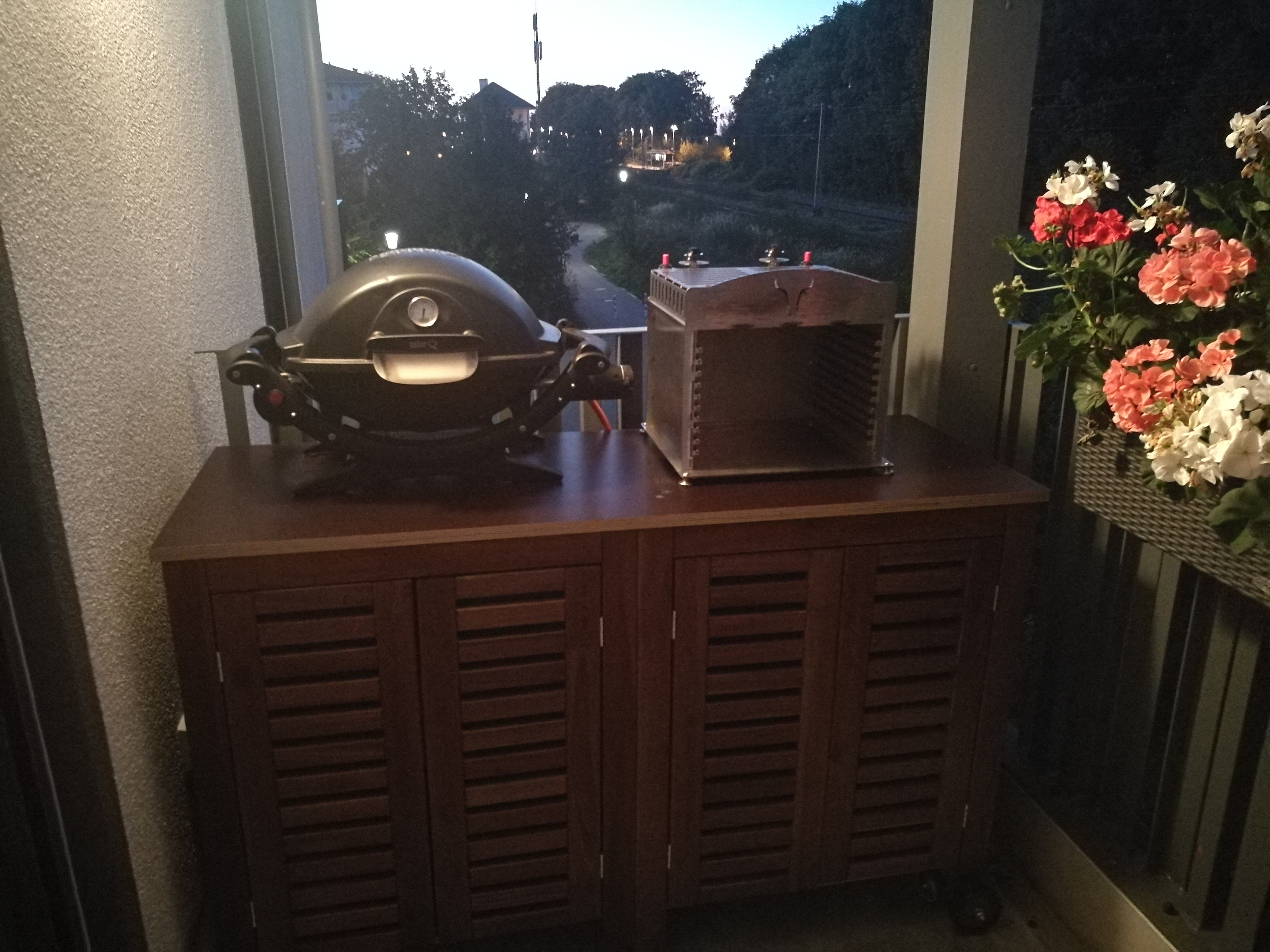 nachdem gerade der Bau meines Grillplatzes stagniert, hier mein aktueller Zwischenstand. Besteht aus 2 IKEA Äpplarö, die ich ohne Tischplatte gekauft habe. Kosten dann 99€ das Stück. Habe beide zusammengeschraubt und mit einer gemeinsamen Bodenplatte verbunden. Diese hat zusätzlich noch drehbare Rollen drunter, so dass man das Ungetüm halbwegs bewegen kann. Den Stoff auf der Rückseite habe ich durch eine gemeinsame Rückwand aus dünner Betonschalplatte ersetzt. Stattdessen ist die Stoffbespannung von innen an die Türen getackert und soll so Verstaubung verhindern. Die Seiten sind ebenfalls mit Betonschalplatte, diesmal jedoch zusätzlich zum Stoff dicht gemacht.