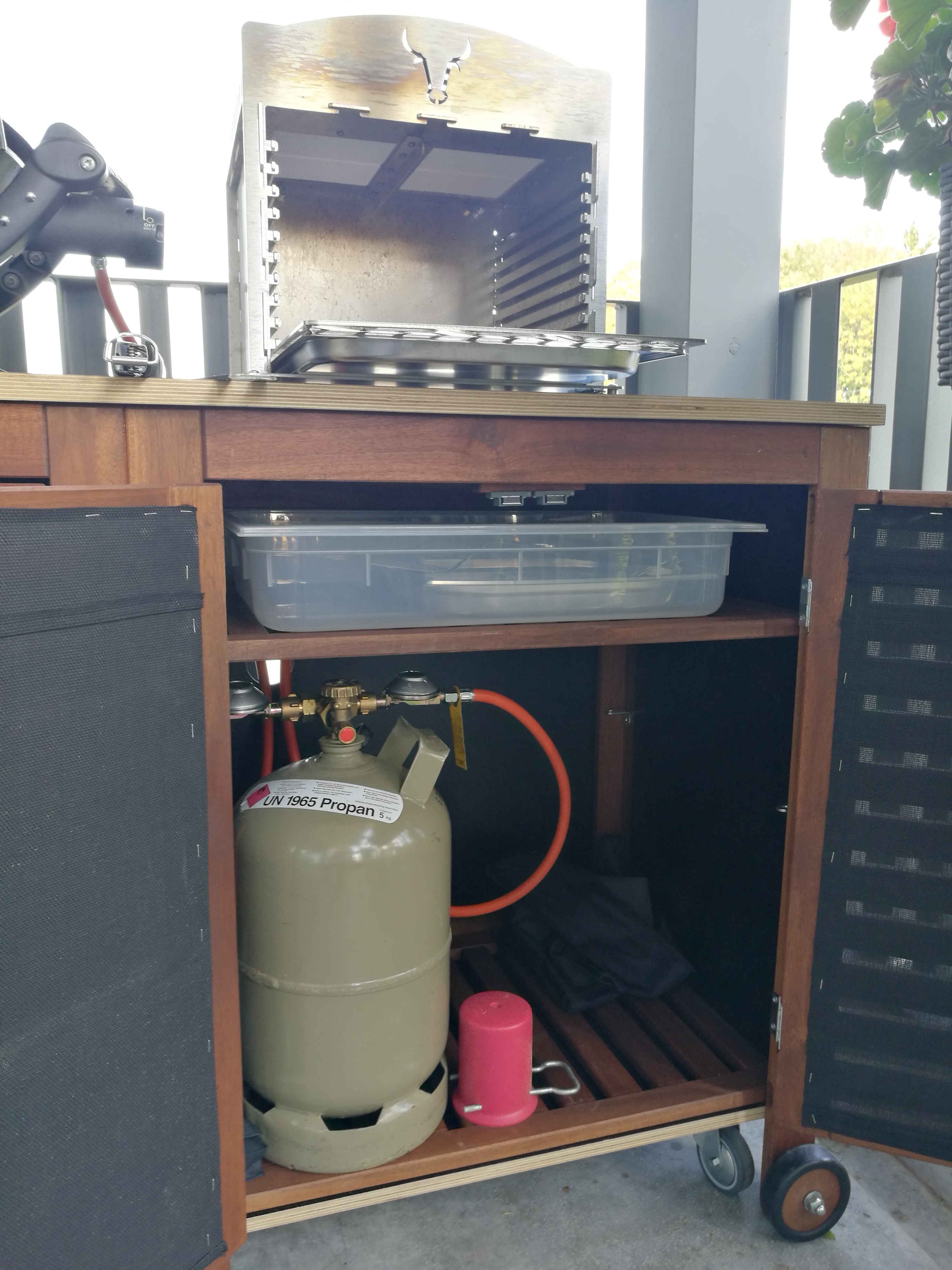Rechter Boden ist für die Gasflasche höher montiert, oben passt dann eine 1/1 GN-Schale 10cm quasi als Schublade rein. Provisorisch ist noch die Siebdruckplatte oben drauf. Am liebsten hätte ich Stein, Beton oder eine große Fliese, ist mir aber noch nicht über den Weg gelaufen... Bin für Tipps dankbar.