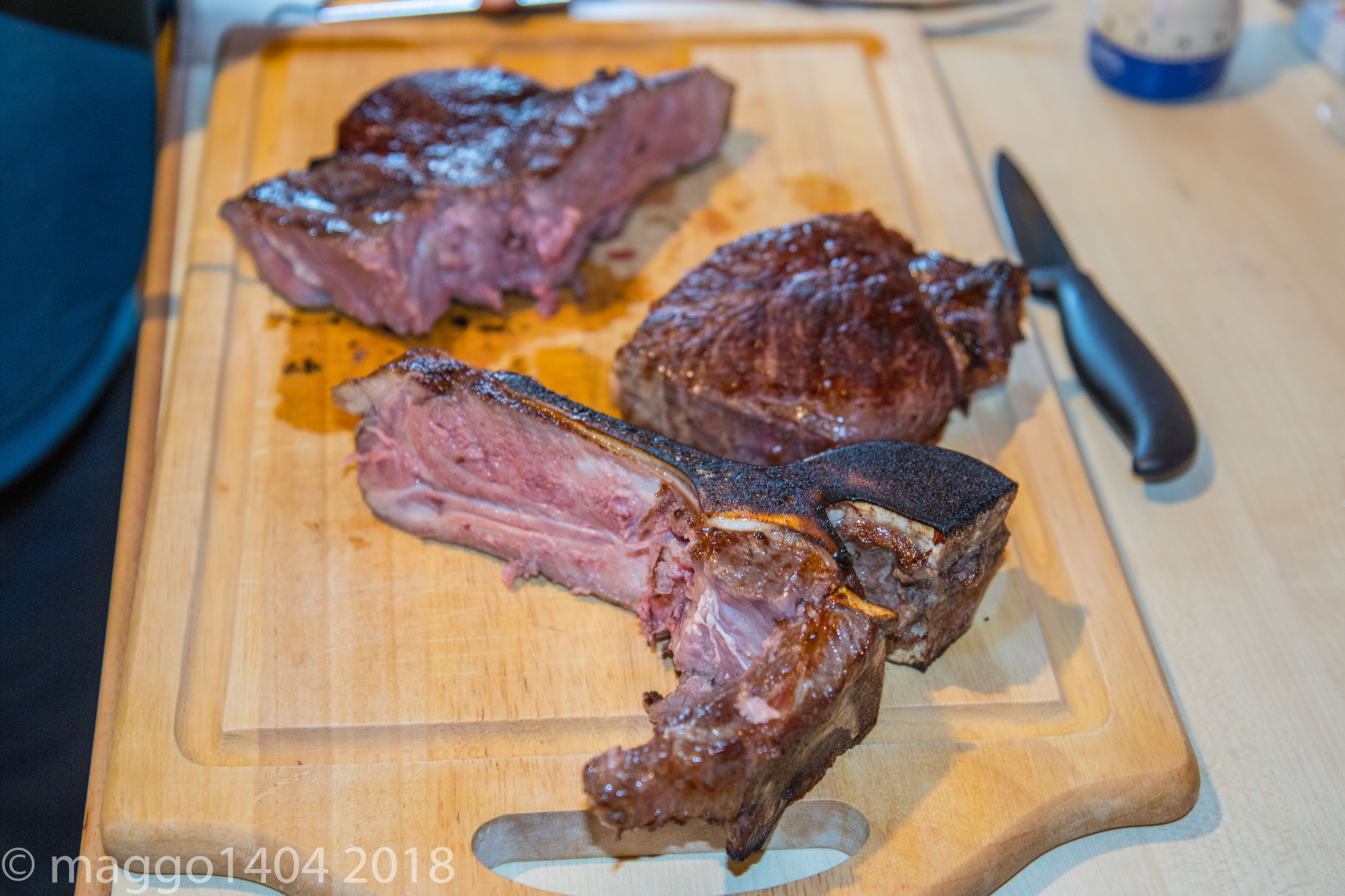 Ausgebackt und trocken gelegt. Zum Größenvergleich ist eine GN1/2 schale untergelegt. Das übliche Einschweißen. Gewürzt mit Salz, Pfeffer und ein paar Rosmarin-Zweige. Nach dem Sous Vide kochen. Bei 4,5 Stunden (geplant 4 Stunden, Gäste kammen zu spät) bei 55°C. Jetzt kommt der spannendste Teil, das Oberhitze grillen. Das schöne Rind unter der Sonnenbank